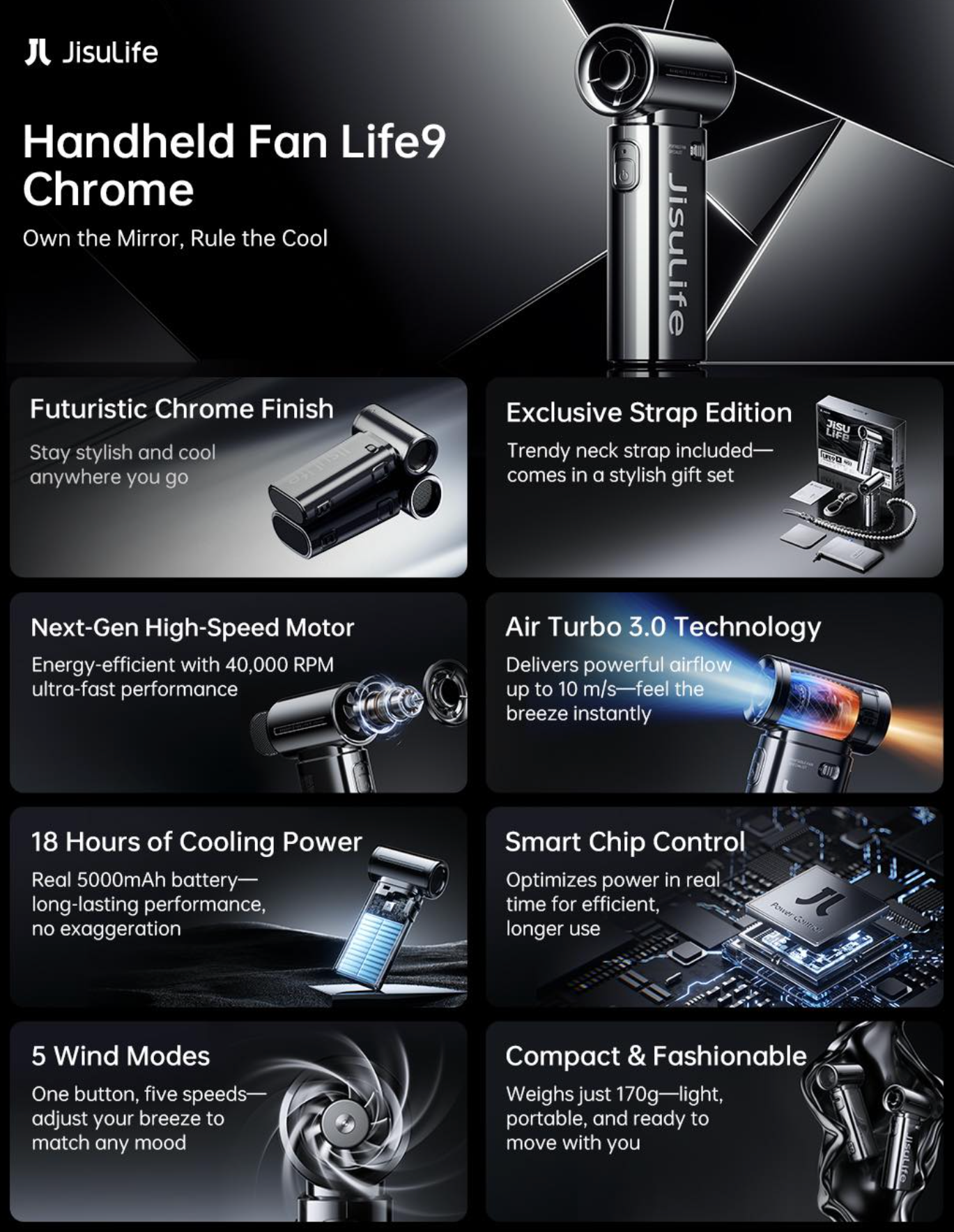 Ultimate Cooling Experience: JISULIFE handheld turbo fan adopts an advanced 9-blade design and is paired with a high-speed three-phase brushless motor to provide a maximum wind speed of up to 10m/s. Maximum 40000 RPM, four times that of ordinary handheld fans.